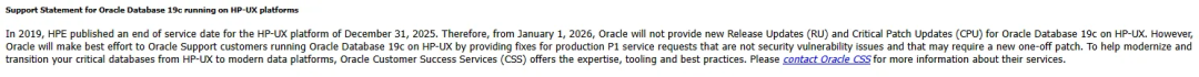 近期,Oracle MOS 上发布了一篇关于 #HP-UX 操作系统支持策略的文档 (Doc ID 3080621.1),文档指出,HP 官方早在 2019 年就公布了 HP-UX 平台的服务结束日期截止到 2025 年 12 月 31 号,因此自 2026 年 1 月 1 号开始,Oracle 也将不再为 HP-UX 平台上的 Oracle 19c 数据库提供新的版本升级和关键补丁升级。当然,Oracle 将尽最大努力为运行在 HP-UX 平台上的 19c 数据库提供客户支持服务,对于非安全漏洞问题引发的生产 P1 级故障提供修复和必要的一次性补丁。