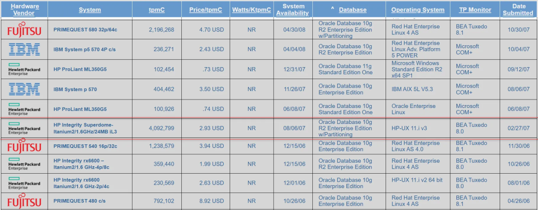 早在 2006 年双方联手加速推动客户采用 HP Integrity 解决方案,Oracle 宣布其 Database 和 ERP 等产品支持在 HP-UX 的 HP Integrity 服务器上运行,并且提供超值的优惠政策。同年 7 月双方联合发布“参考配型”方案,针对 Oracle 10g 与 HP 服务器、存储平台进行协同设计,通过平衡 I/O 吞吐量和资源分配,显著提升复杂查询性能,尤其是“一代神机”- HP Superdome 和 Oracle 数据库的组合曾多次刷新 TPC 性能测试世界纪录,碾压同时期的竞争对手。