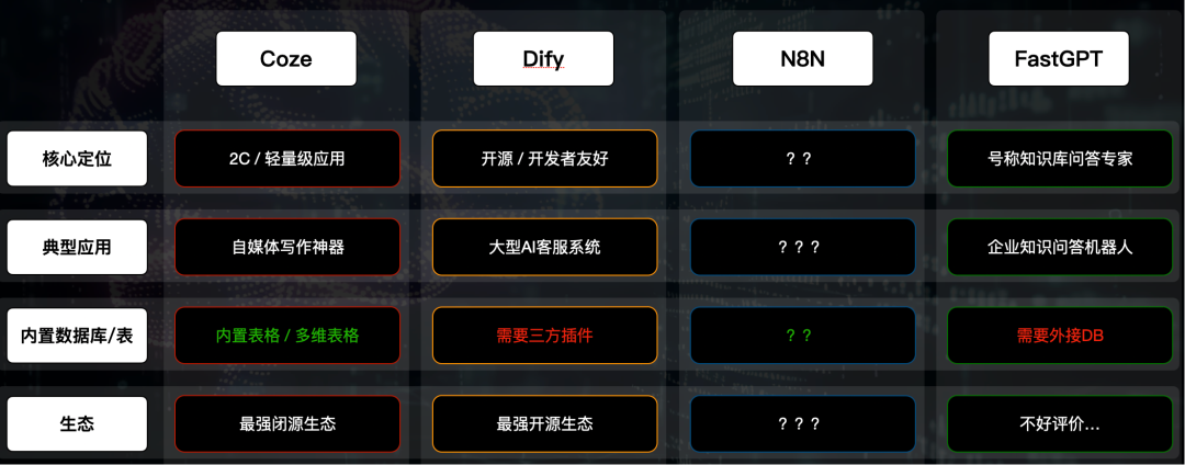 Coze得益于飞书体系的加持以及本身产品体验过硬,牢牢占据着2C的市场;而Dify由于其开源的生态位,在2B私有化部署这块一直占据第一的身位。