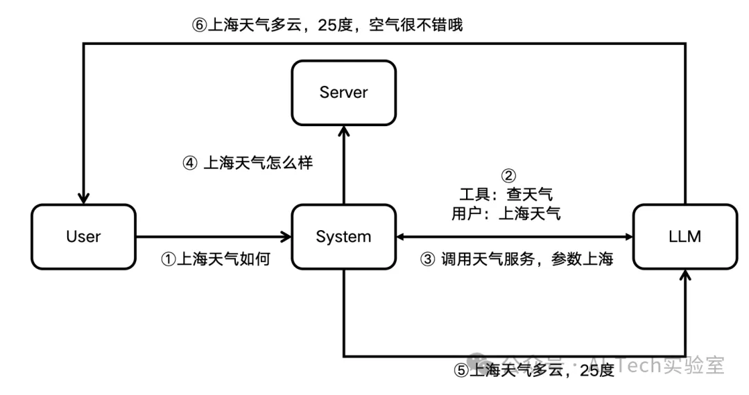 用户问系统"上海天气如何?" 系统加工后转发给模型