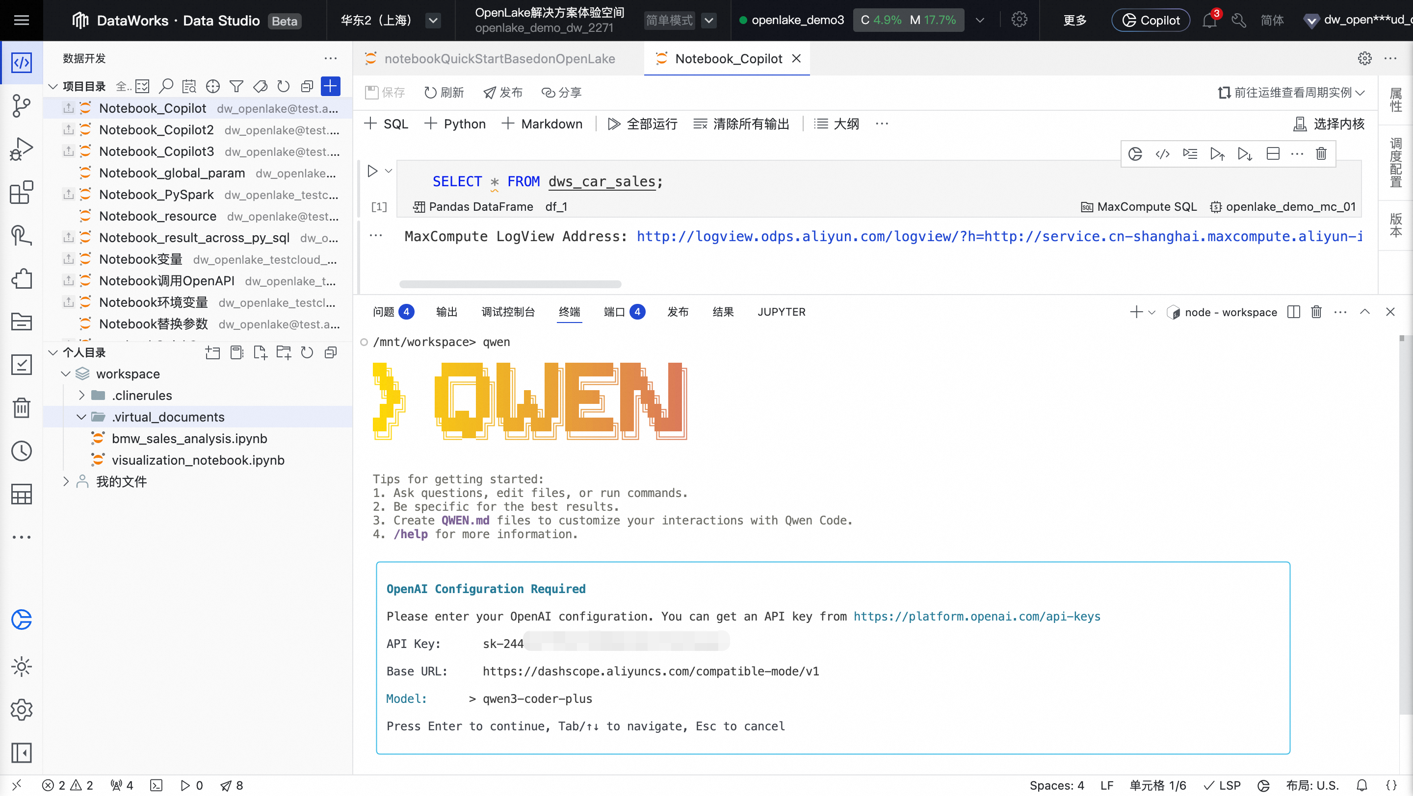 阿里云一站式智能大数据开发治理平台DataWorks正式接入Qwen3-Coder模型。用户通过DataWorks Copilot智能助手即可调用该模型,通过自然语言交互完成多种代码操作,实现数据开发、数据分析的快速实现。同时DataWorks个人开发环境,支持Qwen-Code和Claude Code的命令行Agent安装,用户自然语言交互,即可在个人开发环境的文件目录中快捷生成Notebook文件和相应代码,完成数据分析和算法构建等过程,进一步提升数据开发效率。