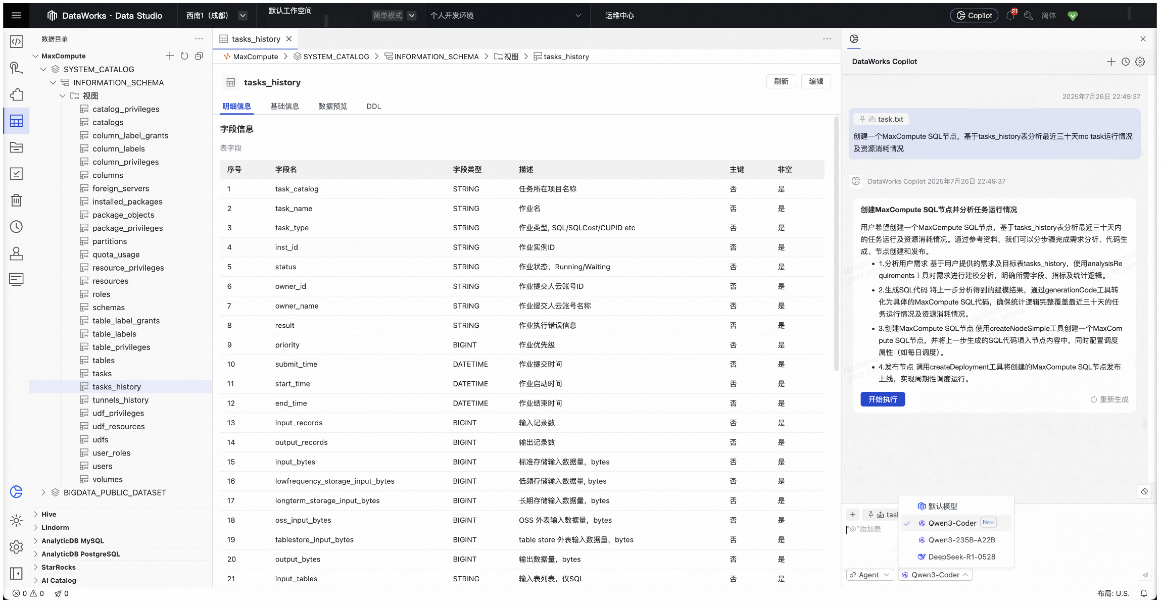 DataWorks Copilot 可选择 Qwen3-Coder模型