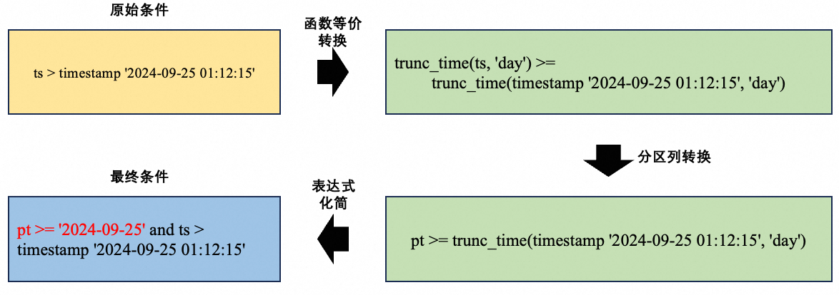如果查询条件中的函数与分区键定义函数语义完全等价,如datetrunc(ts, ‘day’)与trunc_time(ts, ‘day’),那么对于ts列的过滤条件可以做等价转换,这个过程也依托内置函数理解框架来实现。