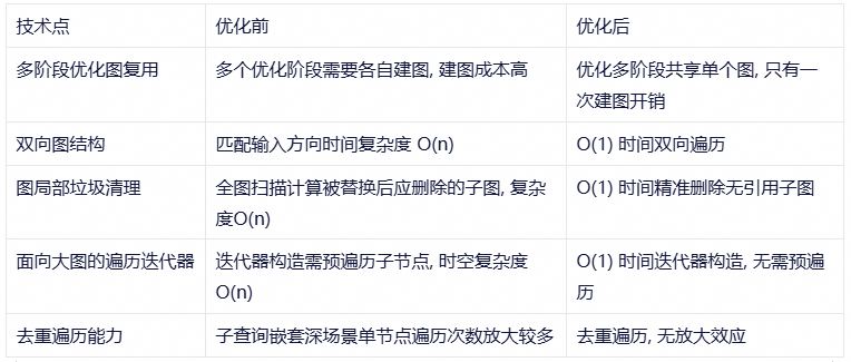 我们支持了对这三类信息的缓存以及局部复用。 由于实际计划中存在大量相似信息结构, 在实际优化过程中将相关对象哈希和相等比较计算复杂度, 以及所需内存空间降低了几个数量级。