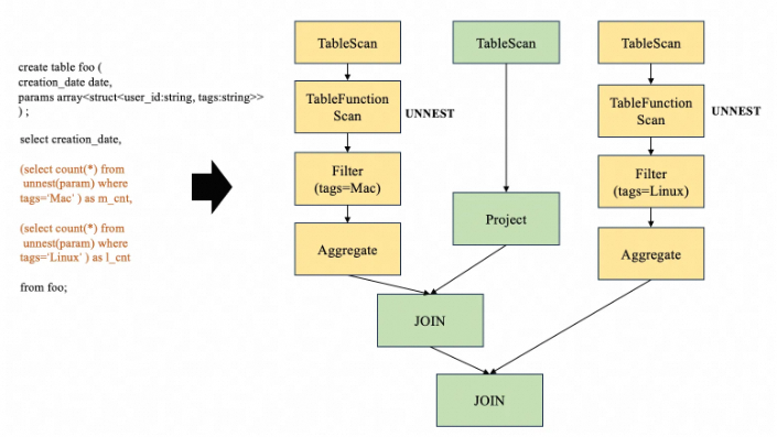UNNEST被拆解为 多次 TableScan 和 Join,资源消耗激增。 -