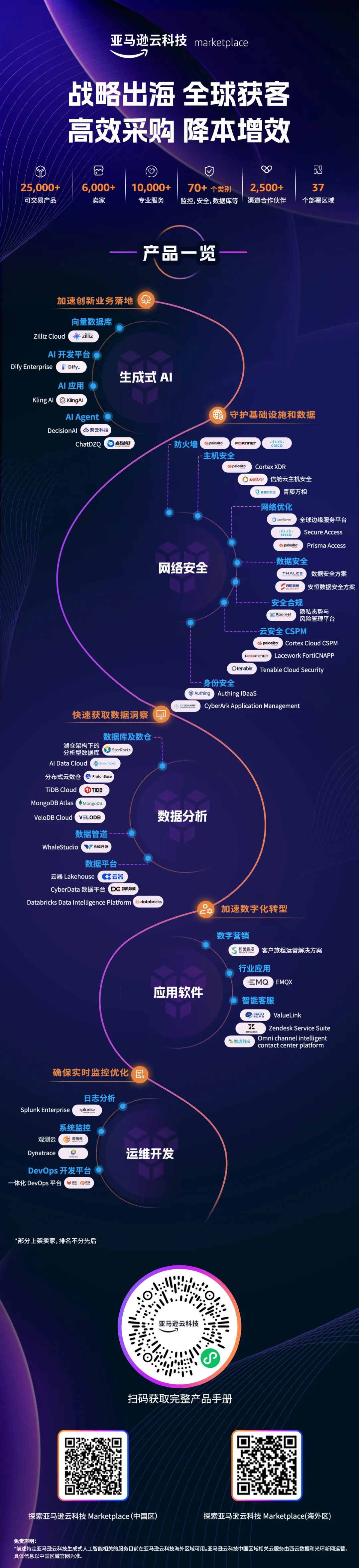 我们隆重发布“亚马逊云科技Marketplace产品手册”,助您一站式快速了解六大品类:生成式AI、数据分析、网络安全、运维开发、应用软件的热门解决方案,帮助企业高效采购和降本增效。