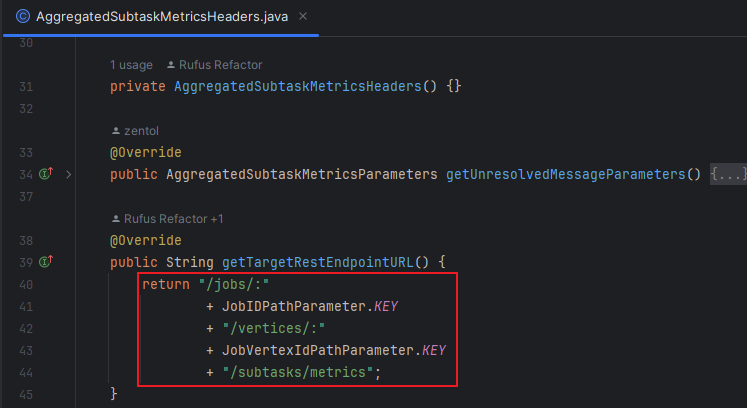 源码中搜索接口路径/subtasks/metrics,可以看到后端对应于Flink runtime模块中的AggregatedSubtaskMetricsHeaders,如图所示: