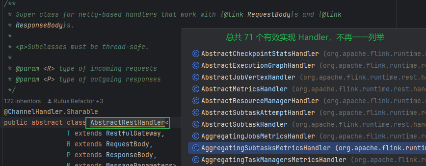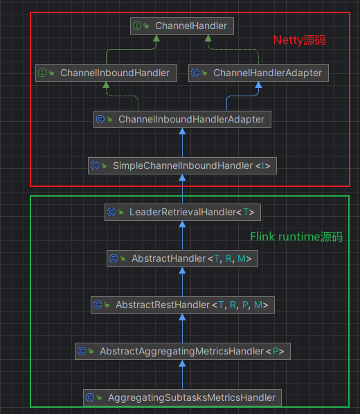 该Header对应的Handler是AggregatingSubtasksMetricsHandler,依次继承自Flink Runtime模块中的AbstractAggregatingMetricsHandler、AbstractRestHandler,AbstractHandler、LeaderRetrievalHandler,继续继承自Netty中的Handler类(不再列举),如图所示: