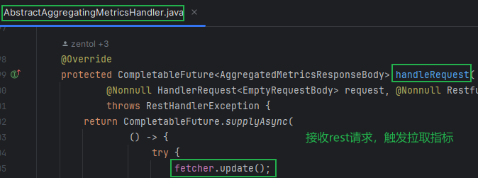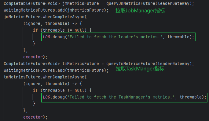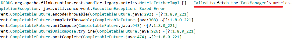 该方法中通过MetricFetcher类的update方法、fetchMetrics方法从JobManager和TaskManager拉取指标数据。在fetchMetrics方法中看到关键信息,通过CompletableFuture异步拉取指标数据时候,如果失败,不做任何处理,只是打印debug级别日志,如图所示: