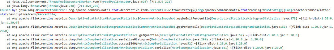 DEBUG org.apache.flink.runtime.rest.handler.legacy.metrics.MetricFetcherImpl [] - Failed to fetch the TaskManager's metrics.java.util.concurrent.CompletionException: java.util.concurrent.ExecutionException: Boxed ErrorCaused by: java.util.concurrent.ExecutionException: Boxed ErrorCaused by: java.lang.NoSuchMethodError: org.apache.commons.math3.stat.descriptive.rank.Percentile.withNaNStrategy(Lorg/apache/commons/math3/stat/ranking/NaNStrategy;)Lorg/apache/commons/math3/stat/descriptive/rank/Percentile;