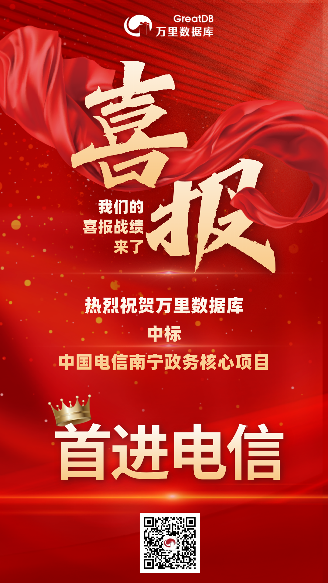 近日,国产数据库领域迎来里程碑式突破——万里数据库自主研发的安全数据库GreatDB成功中标中国电信南宁分公司政务客户数据库采购项目!
