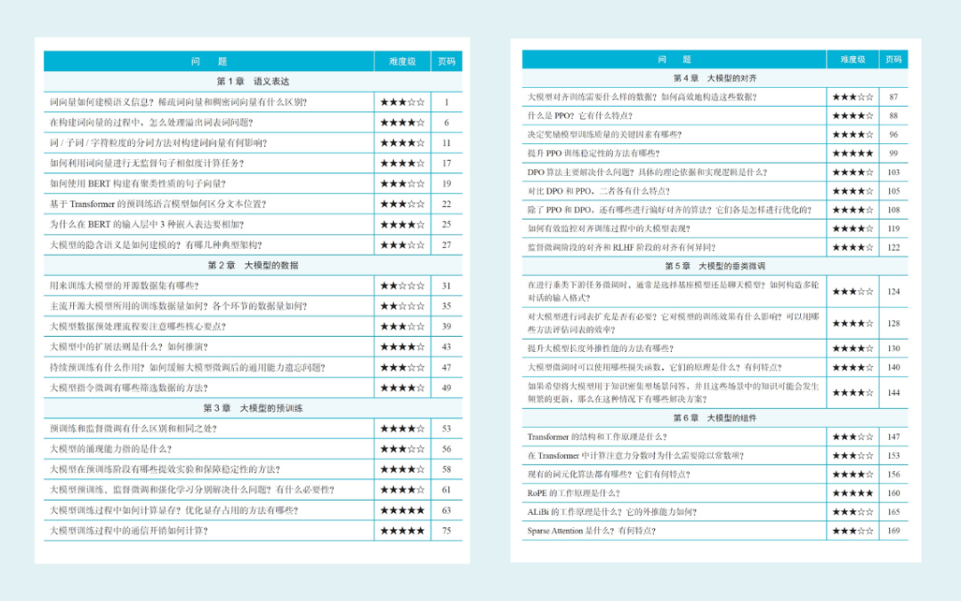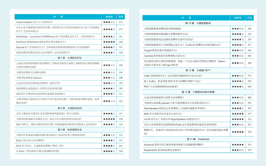 和堆砌题目的传统面试宝典不同,这本《百面大模型》不仅有题,更有“体系”。它是以“面试高频真题”为主线,把大模型领域的核心知识图谱串了起来,既能刷题,也能系统梳理大模型知识点。 作者从一线实践中精选了大约 100 道典型真题,覆盖市面上 95% 的高频考点,这些都是开发者在学习和面试中绕不开的重要内容。 而且每道题都不是简单丢给你一个答案,而是采用问答的方式,讲透开发者最容易卡住、最容易混淆的地方。题目还贴心地标了难度等级(2星到5星)和对应的页码,方便你按图索骥,精准复习,高效查漏补缺。 读这本书,你能感受到那种“前辈带你避坑”的贴心感。它不是高高在上的教学,而是真正站在读者的视角,用实用、有序、易吸收的方式,带你厘清大模型面试背后的逻辑和套路。 总之,如果你不想再“乱学一气”,也不想面试被问得一脸懵,强烈建议你从读这本书开始!