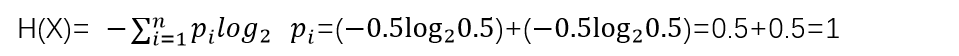 例 1 :两种情形的等概率事件,1 个bit位就可以编码,与计算的熵 =1吻合;