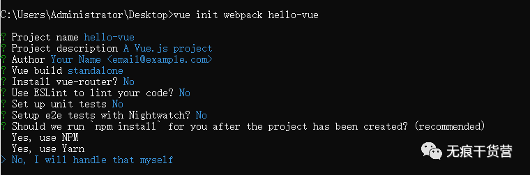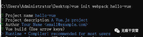 输入指令 vue init webpack hello-vue 即 vue init webpack ”项目名称“