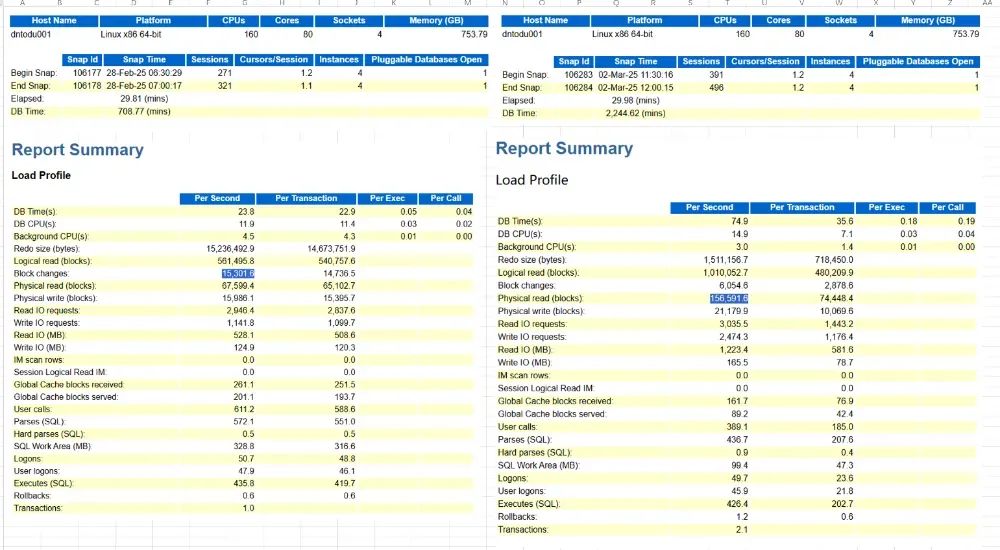 2月28日执行该类型SQL时 数据库整体节点1每秒物理读为 67599,IOPS 4088.2次,MBPS 653M。 3月02日执行该类型SQL时 数据库整体节点1每秒物理读为156591,IOPS 5509.8次,MBPS 1388.9M。