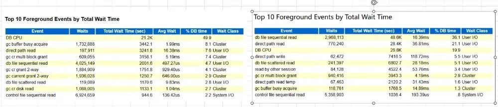 db file sequential read: 2月28日,平均每次等待 1ms不到; 3月02日,平均每次等待 16ms; 3月02日是2月28日的平均等待时长的16倍以上。 direct path read: 2月28日,平均每次等待 16.38ms; 3月02日,平均每次等待 36.81ms; 3月02日是2月28日的平均等待时长的2.25倍。 db file scattered read: 2月28日,平均每次等待 9.83ms; 3月02日,平均每次等待 28.18ms; 3月02日是2月28日的平均等待时长的2.87倍。