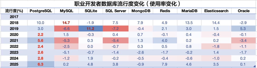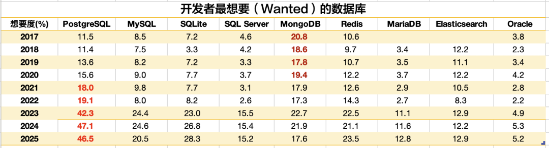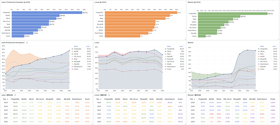 专业开发者使用率趋势图:https://g.pgsty.com/d/sf-survey/stackoverflow-survey?orgId=1&from=2016-12-31T00:00:00.000Z&to=2025-01-31T00:00:00.000Z&timezone=browser&viewPanel=panel-10[5]
