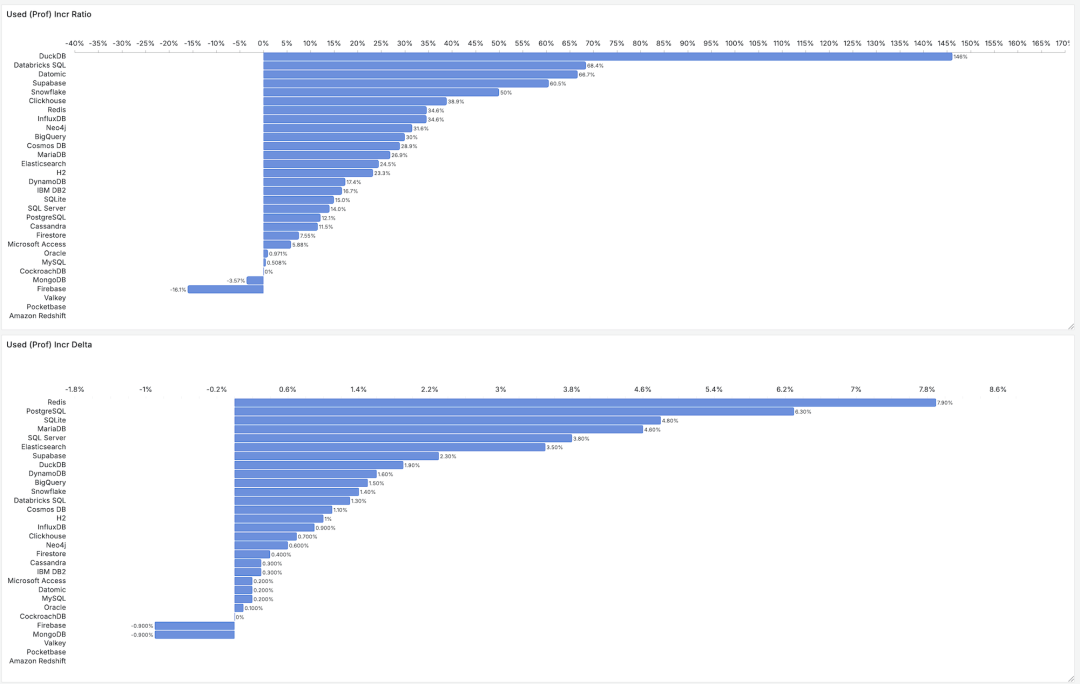 此外,值得一提的是 Supabase 与 DuckDB 成为这一榜单上的 “黑马”, Supabase 在2023 年调查中首次以 2.6% 的开发者使用率初次上榜 —— 在 2024 年提高至 3.8%,并在今年取得了 6% 的使用率,以几乎是指数增长的态势,成为 AI 时代仅次于 PostgreSQL 的数据库大赢家 —— 毕竟 Supabase 本质上就是套了壳的 Postgres。 而作为 Firebase 的开源替代,Supabase 的崛起也对应着 Firebase 的大幅滑落(-16.1%)。