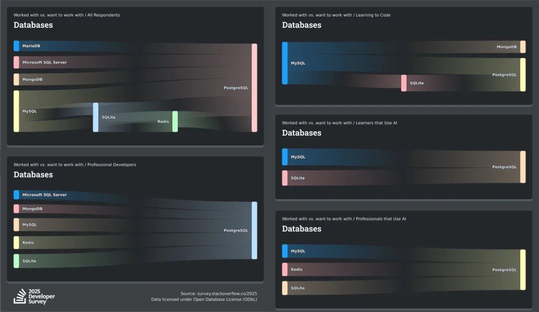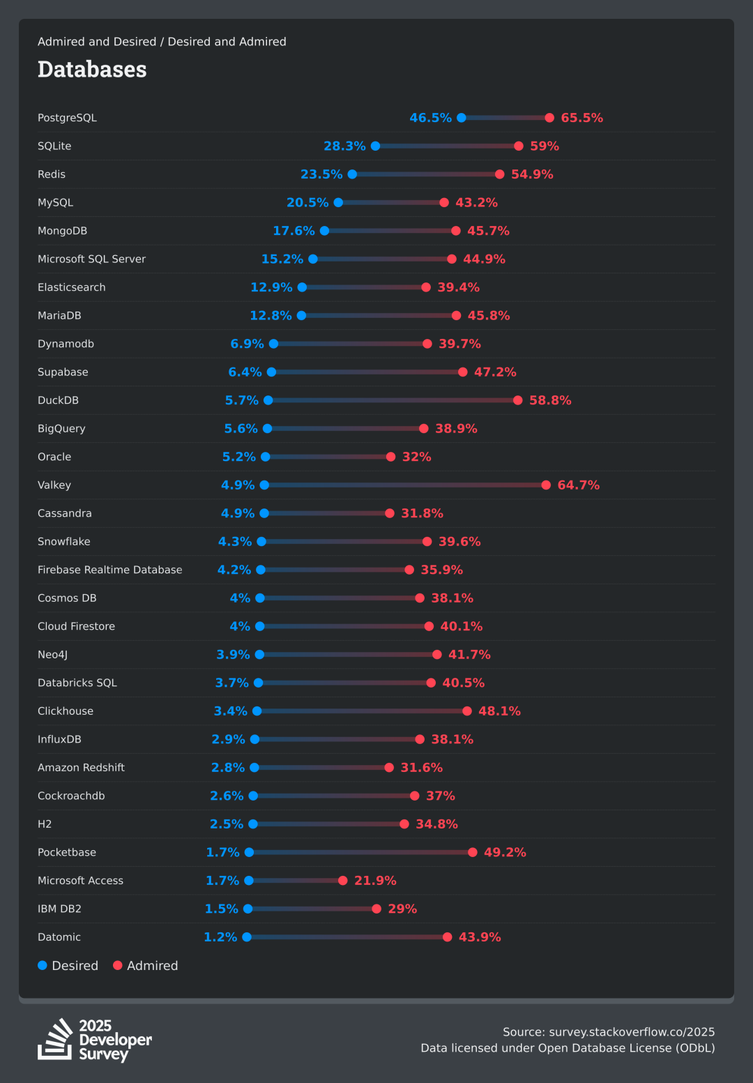 全体开发者在过去一年最喜爱与最想要使用的数据库: https://survey.stackoverflow.co/2025/technology#2-databases