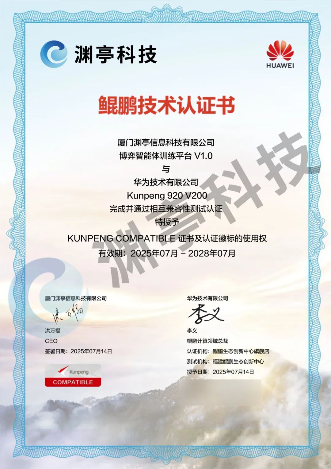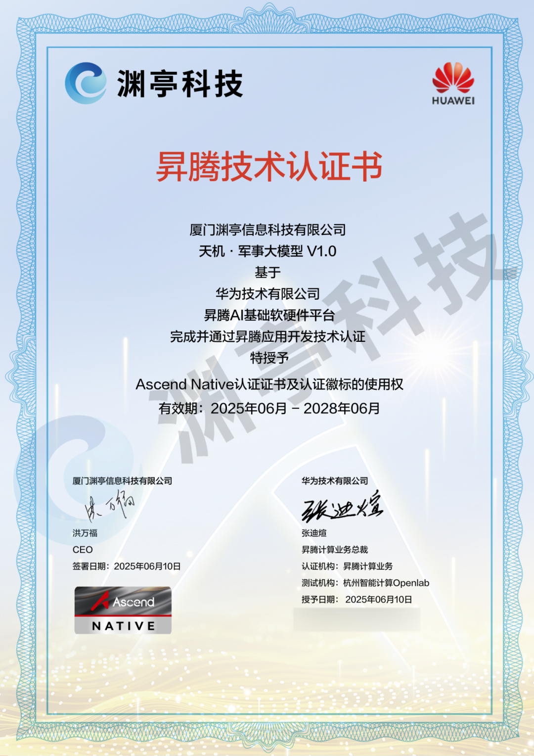 近日,由渊亭科技自主研发的“天机·军事大模型”与“天衍·博弈智能体训练平台”,分别成功通过华为昇腾(Ascend)应用开发技术认证、华为鲲鹏(Kunpeng)相互兼容性测试认证。