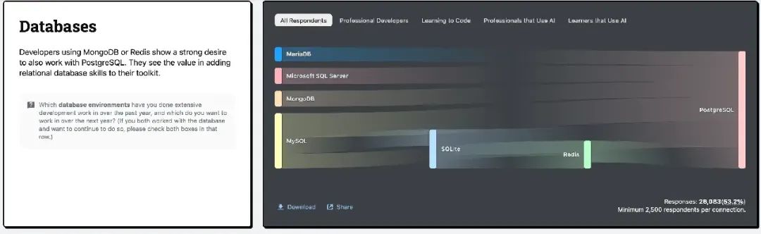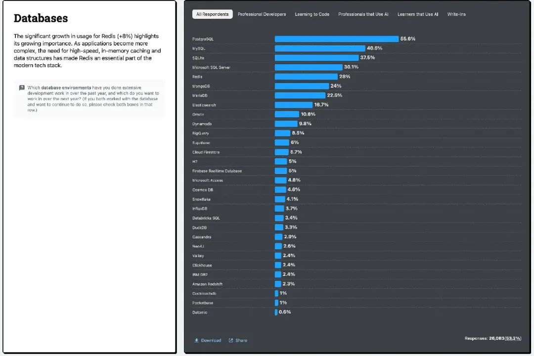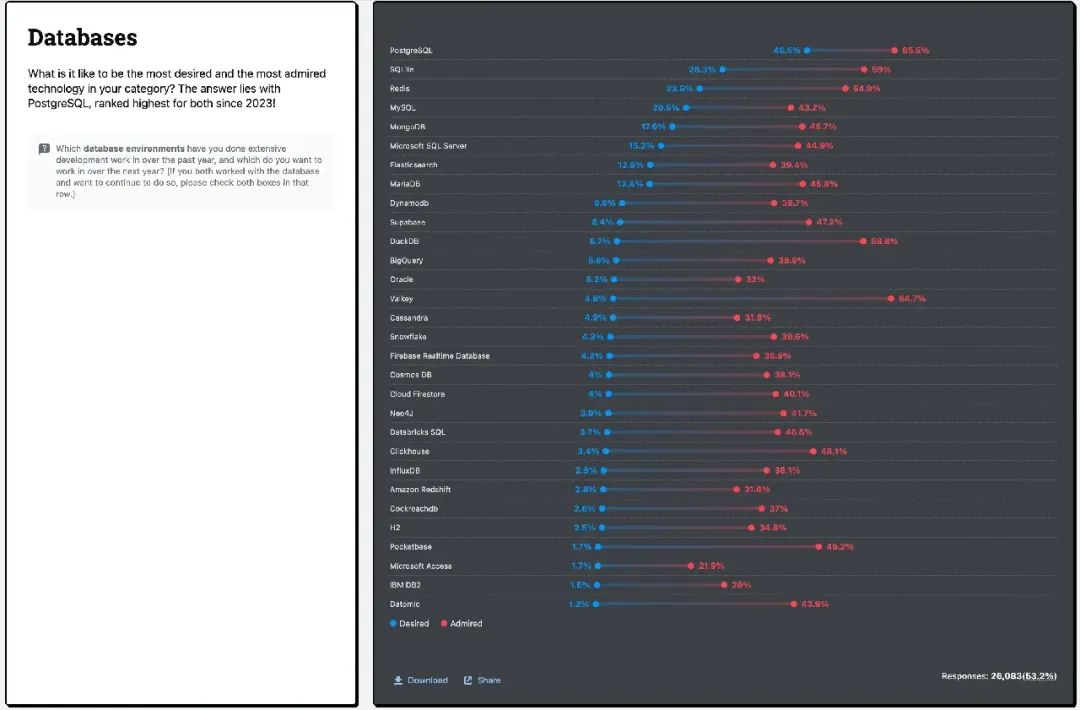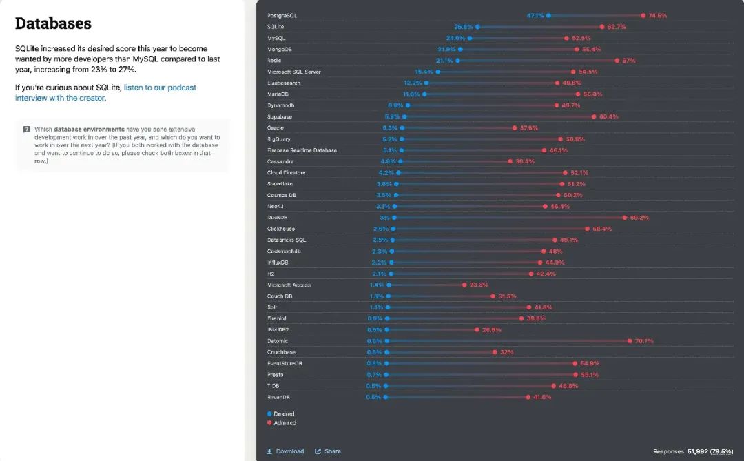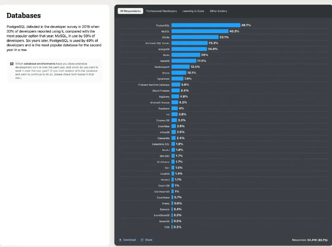 Stack Overflow 刚发布了 2025 年度的开发者调研。数据库方面 Postgres 的优势进一步拉大。