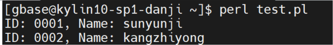 gbase> insert into test_perl values ('0001', 'sunyunji'),('0002', 'kangzhiyong');编写Perl样例测试代码: