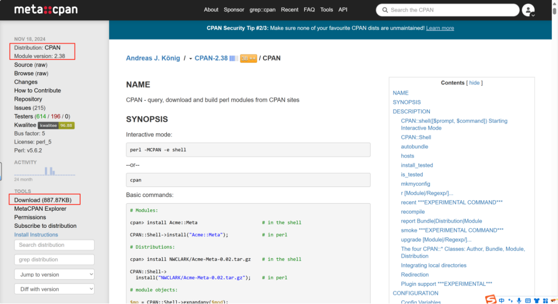 CPAN模块安装采用下载安装包,离线编译安装方式。首先登录网站:https://metacpan.org/pod/CPAN