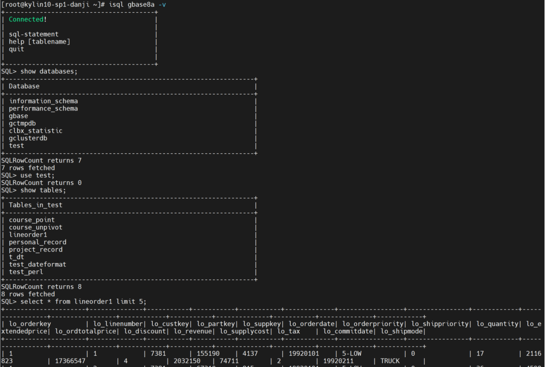 执行 isql gbase8a -v,使用isql连接GBase8a数据库,测试连接正确性: