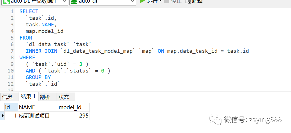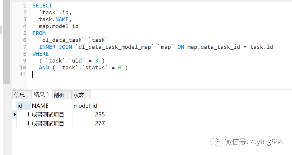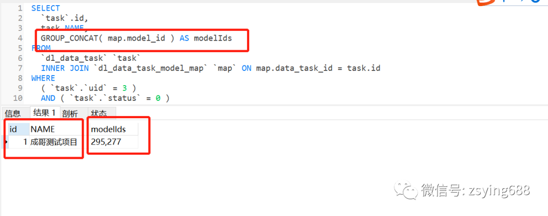 SELECT`task`.id,task.NAME,GROUP_CONCAT( map.model_id ) AS modelIdsFROM`dl_data_task` `task`INNER JOIN `dl_data_task_model_map` `map` ON map.data_task_id = task.idWHERE( `task`.`uid` = 3 )AND ( `task`.`status` = 0 )