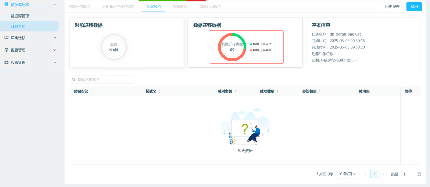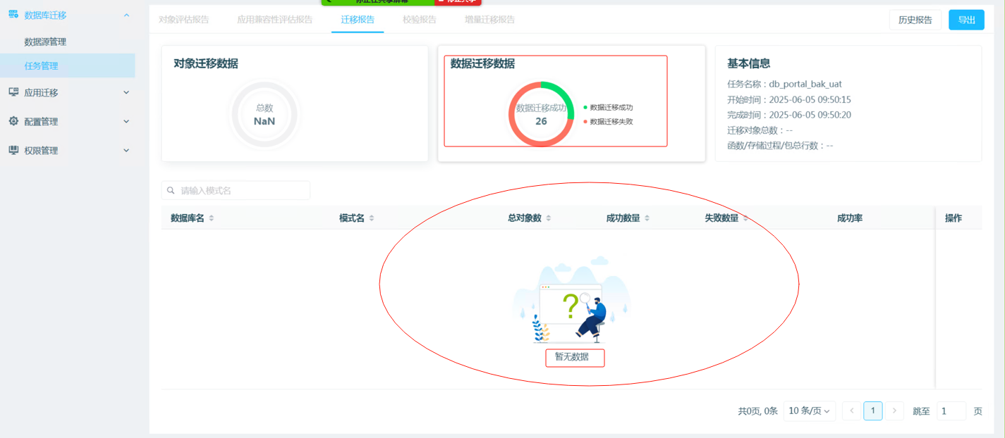 2.运行全量迁移任务后,任务完成,但报26项迁移成功,69项迁移失败,迁移数据量展示框为空白