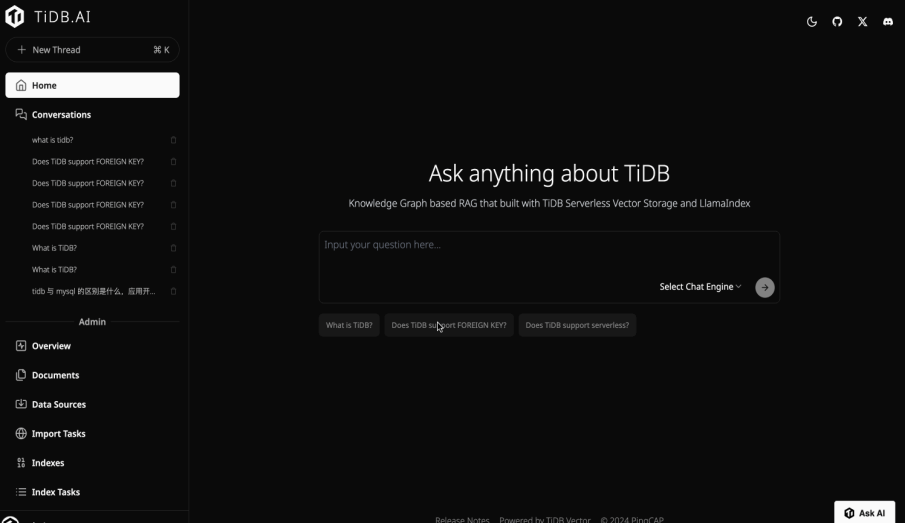 作为数据库厂商,TiDB 自然不愿错过这波 AI 浪潮。最初,团队选择 “不务正业” 地开发 AI 应用,实则是为了探索数据库在 AI 时代如何更好地服务开发者。这一探索从一个问答机器人开始,初衷是解决 DBA 不足、客户重复提问的问题,将内部数据、工单、文档等喂给机器人来辅助回答。但更深层的目的,是通过这个过程研究数据库在 AI 应用中的角色与作用,希望提高能支持 RAG 应用的数据底座的质量和易用度。