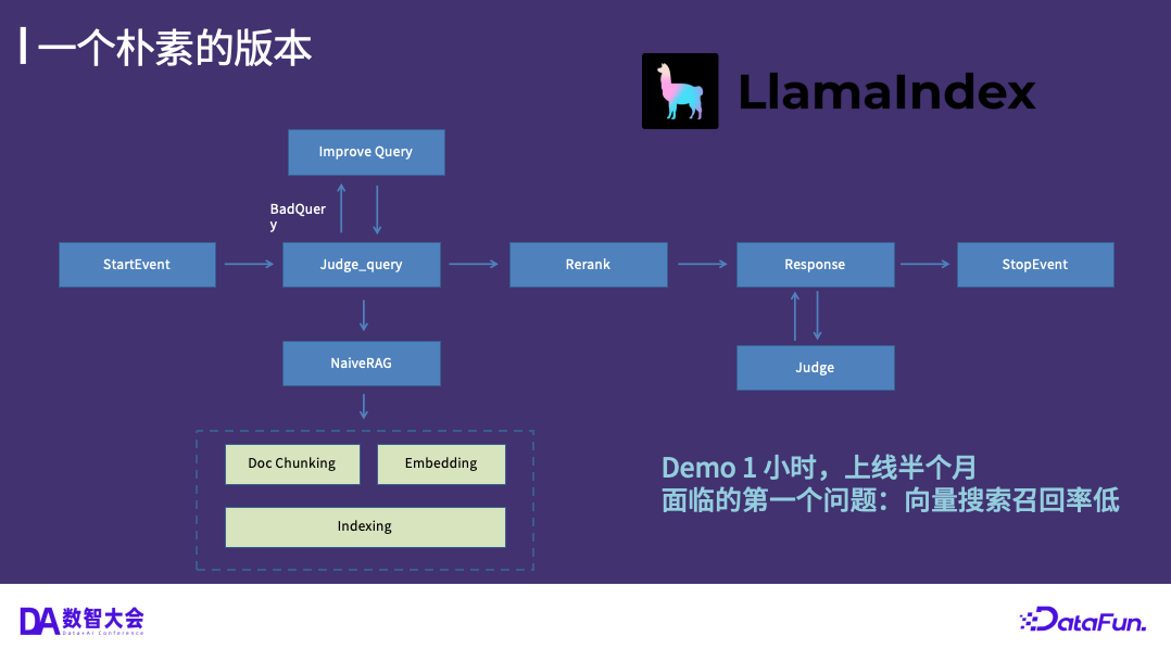 TiDB 团队最早在 2023 年底就开始探索 RAG(检索增强生成)技术,当时选择了 LlamaIndex 框架。其工作流程看似简单:构建知识库,获取上下文,再将 context 丢给大模型。但实际应用中,问题很快显现,向量搜索的召回率不尽如人意,原本以为向量能实现精确搜索,实际却难以召回所需信息。为解决这一问题,团队引入了关键词搜索(如全文索引),采用 “混合召回” 手段,效果有所提升,但面对复杂问题仍力不从心。
