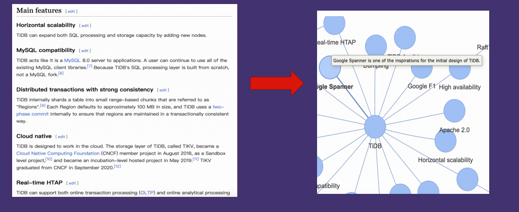 后来微软 2024 年的一篇论文《From Local to Global: A Graph RAG Approach to Query-Focused Summarization》给了 TiDB 团队启发:除了文本分片召回,还可通过实体间的关系进行召回。这促使团队将目光投向知识图谱。