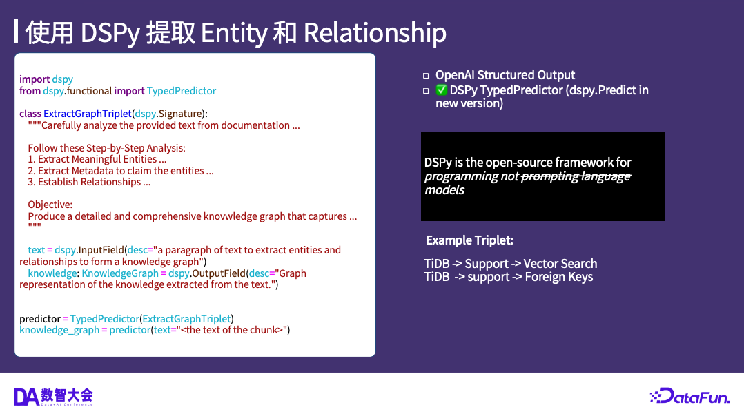 TiDB 使用 DSPy 提取文档中的 Entity(实体)和 Relationship(关系),并将其存储在数据库中,一张表存概念,另一张表存关系,这样就构建起了知识图谱。
