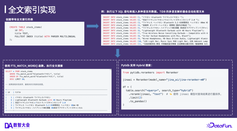 全文索引是处理文本检索的专业工具,对比向量搜索主要关注语义近似(如相同种类内容),而全文搜索主要关注准确匹配(如具体产品名)。两者结合,能有效满足复杂的混合搜索查询需求,显著提升 AI 应用的回答质量与准确性。TiDB 虽为后来者,但仅用 2-3 个月就实现了相关功能。其支持多语言文本检索,包括英文、中文、日文、韩文等,非常适用于 GenAI 的 SaaS 服务,另外 TiDB 也采用 BM25 算法提升搜索相关性,还能与主流 AI 框架良好集成,方便开发者使用。