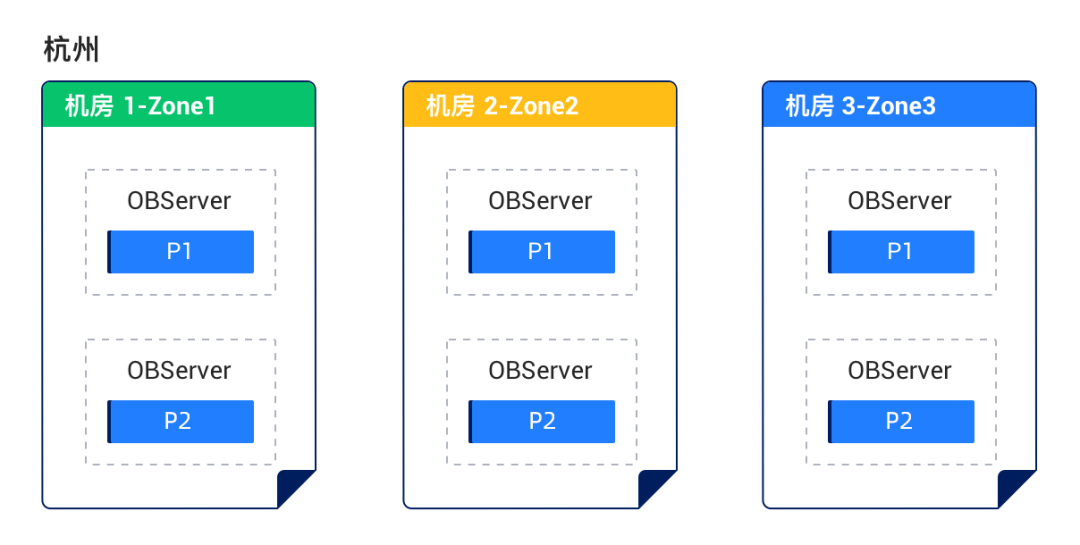 如果同城具备三机房条件,还可以为每个机房部署一个 Zone,从而达到机房级无损容灾能力。任何一个机房不可用时,可以利用剩下的两个机房继续提供服务,不丢失数据。这种部署架构不依赖物理备库,不过不具备地域级容灾能力。