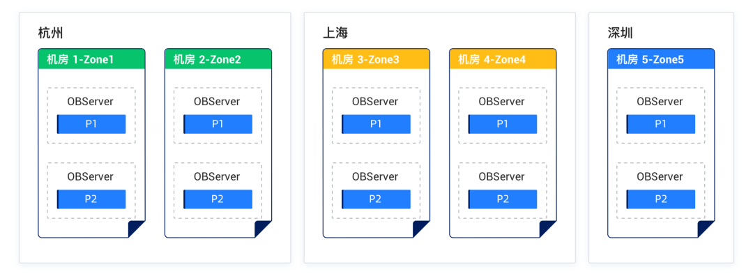 与三地三中心五副本类似,不同点在于,三地五中心会把每个副本部署到不同的机房,进一步强化机房容灾能力。