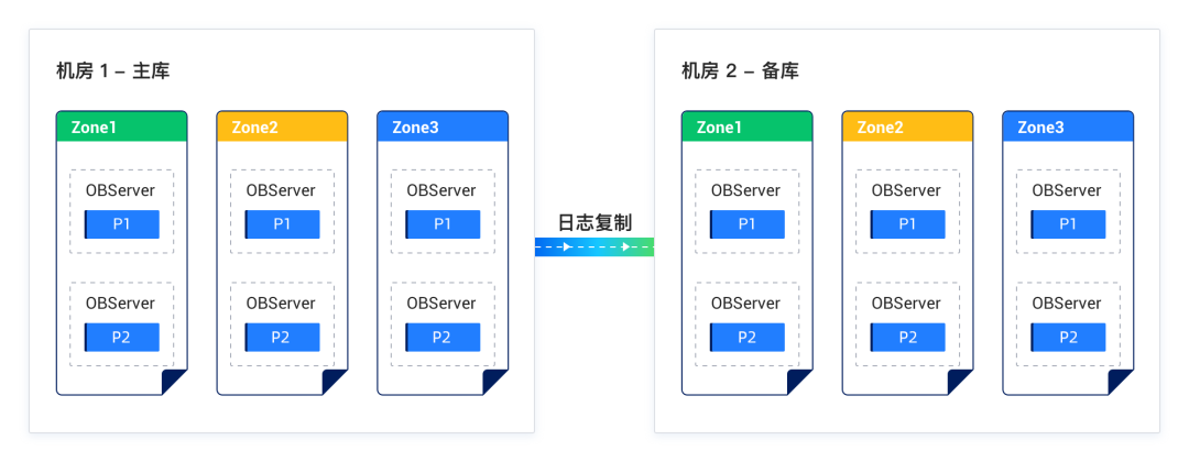 每个机房都部署一个 OceanBase 集群,一个为主库一个为备库;每个集群有自己单独的 Paxos group,多副本一致性。 "集群间" 通过 RedoLog 做数据同步,形式上类似传统数据库 "主从复制" 模式,从主库 "异步同步" 到备库,类似 Oracle Data Guard 中的 "最大性能" 模式。