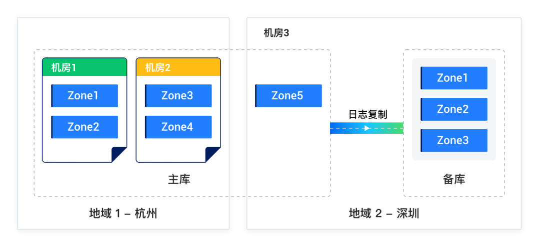 如果用户在两个不同的地域共有三个机房,可以使用 “两地三中心加物理备库” 的方案提供地域级容灾能力。