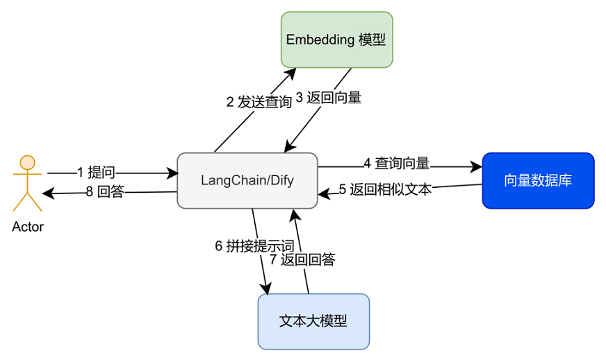 既然向量数据库在大模型之初就已经日臻完善,那么向量数据在大模型应用中又起到了什么作用呢?我们以一个大模型中基本的 RAG 场景来描述它们之间的关系: