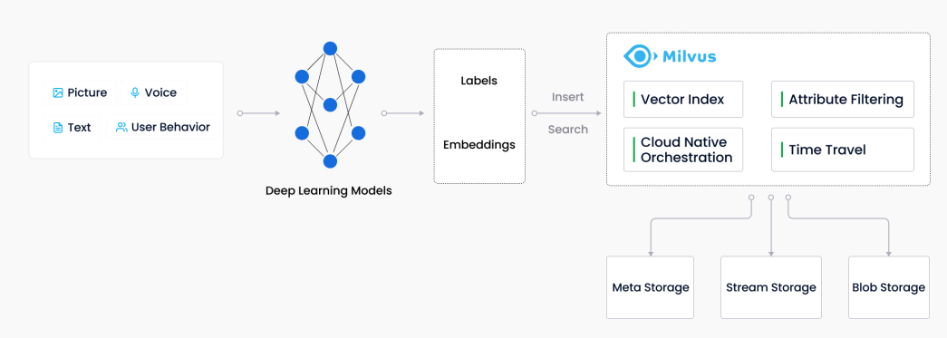 Milvus 于 2019 年创建,目标是存储、索引和管理由深度神经网络和其他机器学习(ML)模型生成的海量嵌入向量。作为一个专门设计用于处理输入向量查询的数据库,它能够对万亿级别的向量进行索引。与主要处理遵循预定义模式的结构化数据的现有关系数据库不同,Milvus 是从底层设计来处理从非结构化数据转换的嵌入向量的。Milvus 的工作流如图: