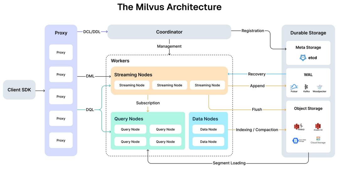 Milvus 是一个云原生向量数据库,Milvus 在设计上将存储和计算分离。为了增强弹性和灵活性,Milvus 中的所有组件都是无状态的。它采用了 Kubernetes 作为其部署和管理的基础设施。这意味着 Milvus 可以在各种云提供商和本地环境中无缝部署和扩展。目前支持 Milvus Operator 和 Helm 部署, 详见 Zilliz 官网中 Milvus 架构概述: