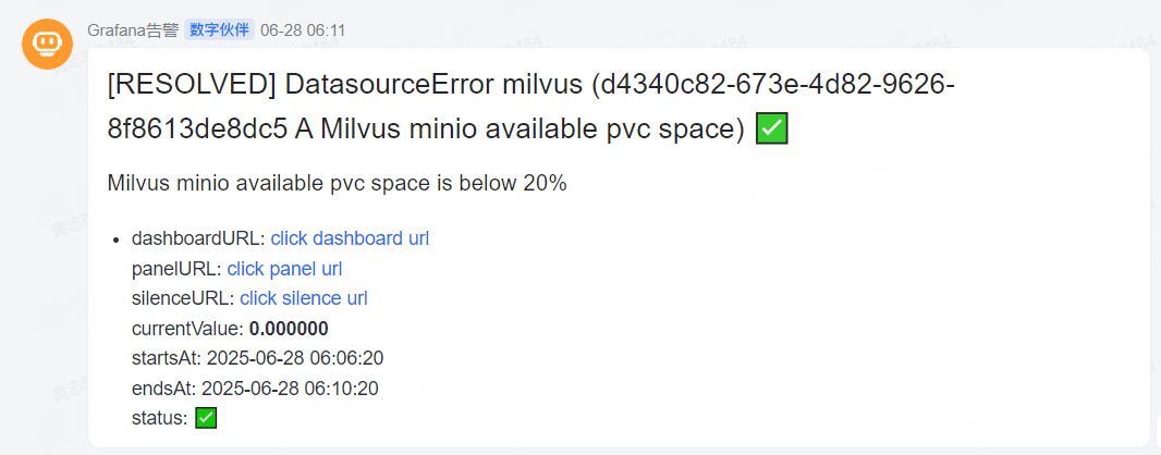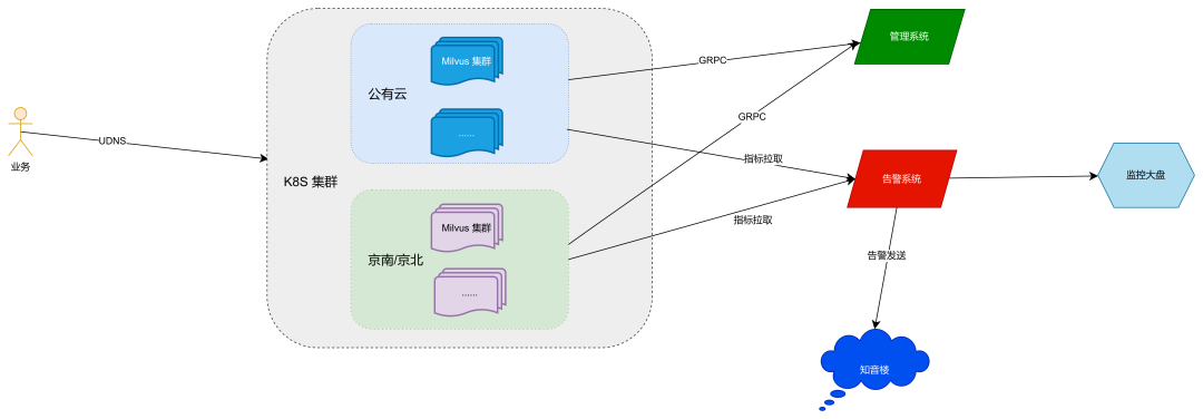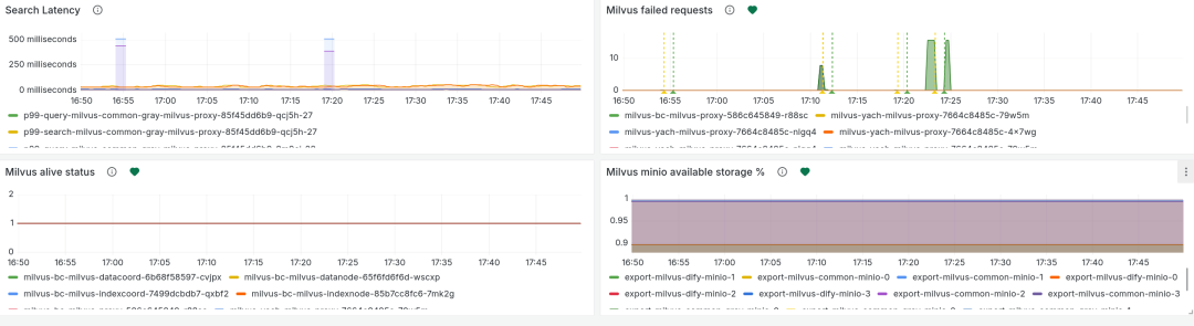 由于 Milvus 的云原生属性,我们使用 Prometheus + Alertmanager 配合钩子实现了分钟级告警提醒到知音楼的功能,方便管理员和业务及时了解服务可能出现的情况。