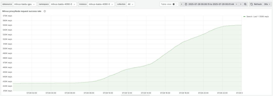 目前 Milvus 核心层存储了10亿+向量,20+集合数,以其中一套Milvus集群为例,单日检索请求量如下: