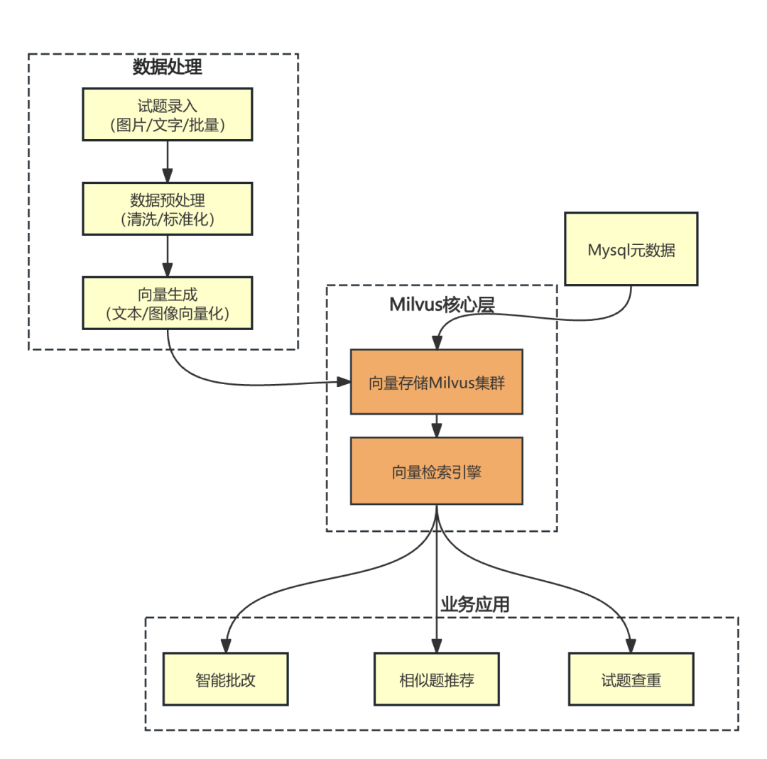 数据处理层是整个系统的基础,负责处理各种来源的试题数据。系统支持多渠道的试题录入,包括 API 接口上传、批量导入和 OCR 识别等方式。对于接收到的试题,首先进行标准化处理,包括格式统一化、特征提取和质量检查。之后,通过先进的算法将处理后的文本和图像转换为向量表示。这一层的设计确保了数据的质量和标准化,为后续的向量存储和检索奠定了基础。