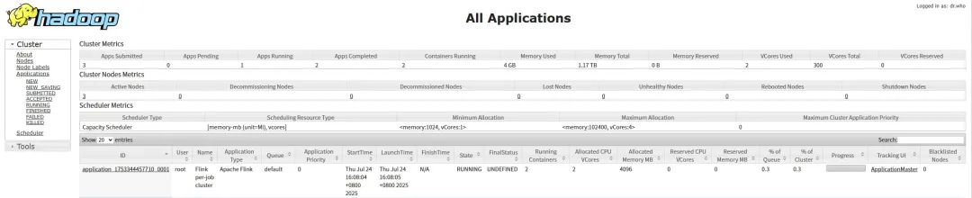 当然运行中的日志也可以通过 flink web ui 查看:resourceMangerIp:8088/proxy/applicationId
