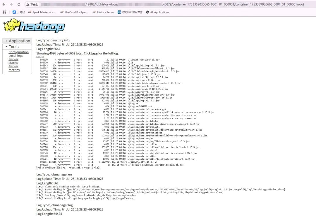 这样再点击 logs ,就可以看到对应的日志了,但是地址已经变了:http://JobHistoryServerIp:19888/jobhistory/logs/nodemanagerIp:40879/container_1753359030665_0001_01_000001/container_1753359030665_0001_01_000001/root