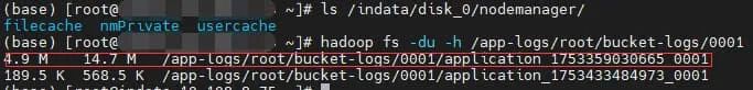 • 那么本地路径为 indata/disk_0/nodemanager/applicationId • 一个 yarn 任务有多个 container ,不同的 container 可能在相同的 nodemanager 也可能在不同的 nodemanager ,本地日志需要去 container 对应的 nodemanager 机器查看 • 如果运行中的任务对应的本地日志文件被意外删除,那么无论通过命令行还是 Web UI 都将看不到日志了