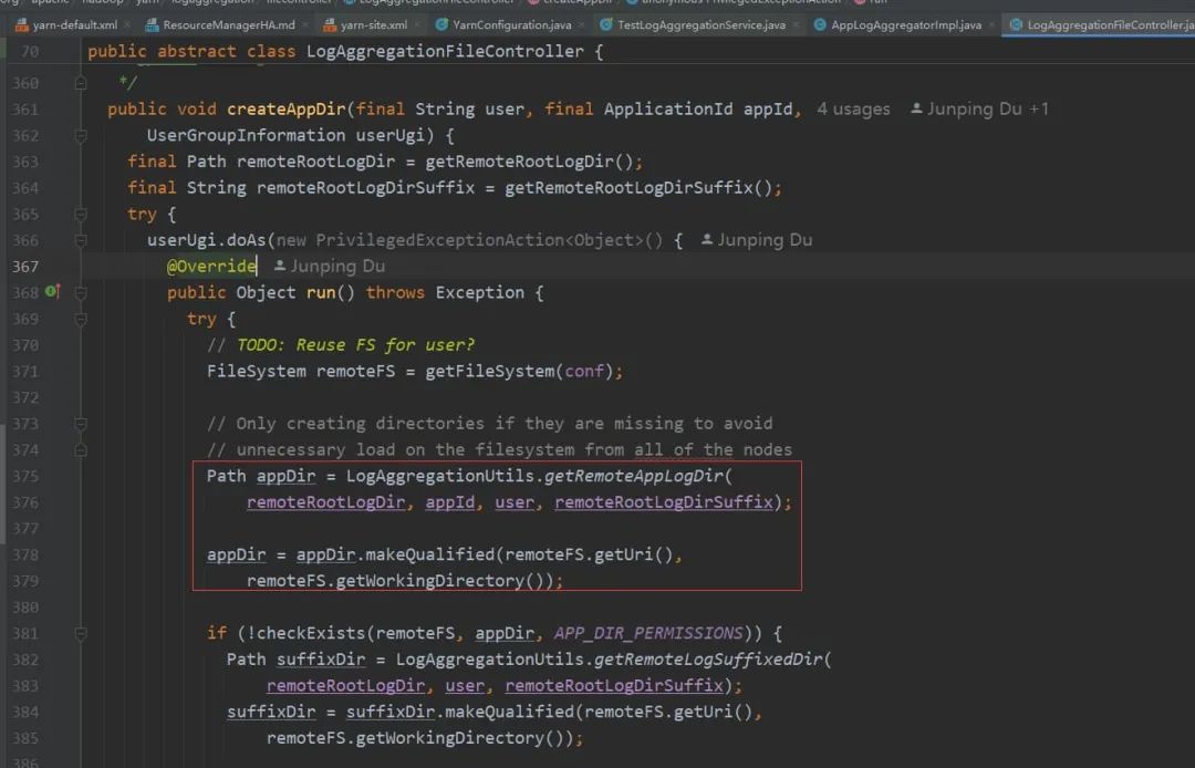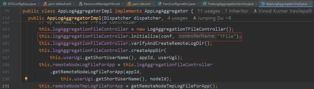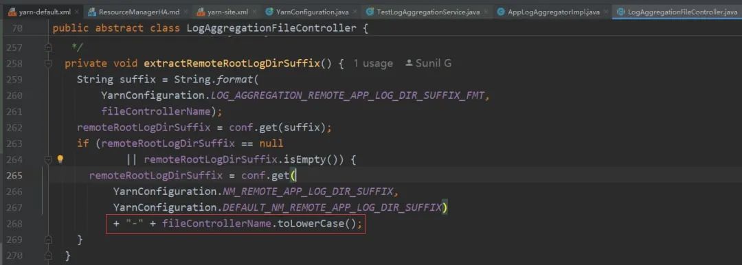 主要逻辑就是先判断有没有设置 yarn.log-aggregation.TFile.remote-app-log-dir-suffix 如果有的话,则 remoteRootLogDirSuffix 取值为 ${yarn.log-aggregation.TFile.remote-app-log-dir-suffix}