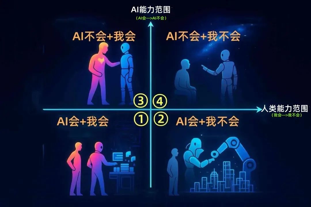 L老师:对。要看清未来,我们不能再用“AI vs 我”的线性思维。我们需要一个二维坐标系,来重新定位自己。这,就是我一直在思考的“人机协作四象限”。(L老师拿出本子,在纸上画了一个十字坐标) 想象一下,Y轴代表AI的能力范围,X轴代表人类的能力范围。将AI会、AI不会、人会、人不会这四个关键元素组合带入坐标中,可得四个象限,四个完全不同的“世界”。它们分别是:第一象限:AI会+我会;第二象限:AI会+我不会;第三象限:AI不会+我会;第四象限:AI不会+我不会。